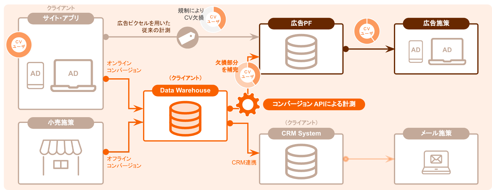 Cookie規制により計測が難しくなっている主要な広告イベントデータをはじめ、オフラインのデータ、および顧客アクションを媒体のサーバーへ直接送信するためのAPI導入の支援サービスを提供します。