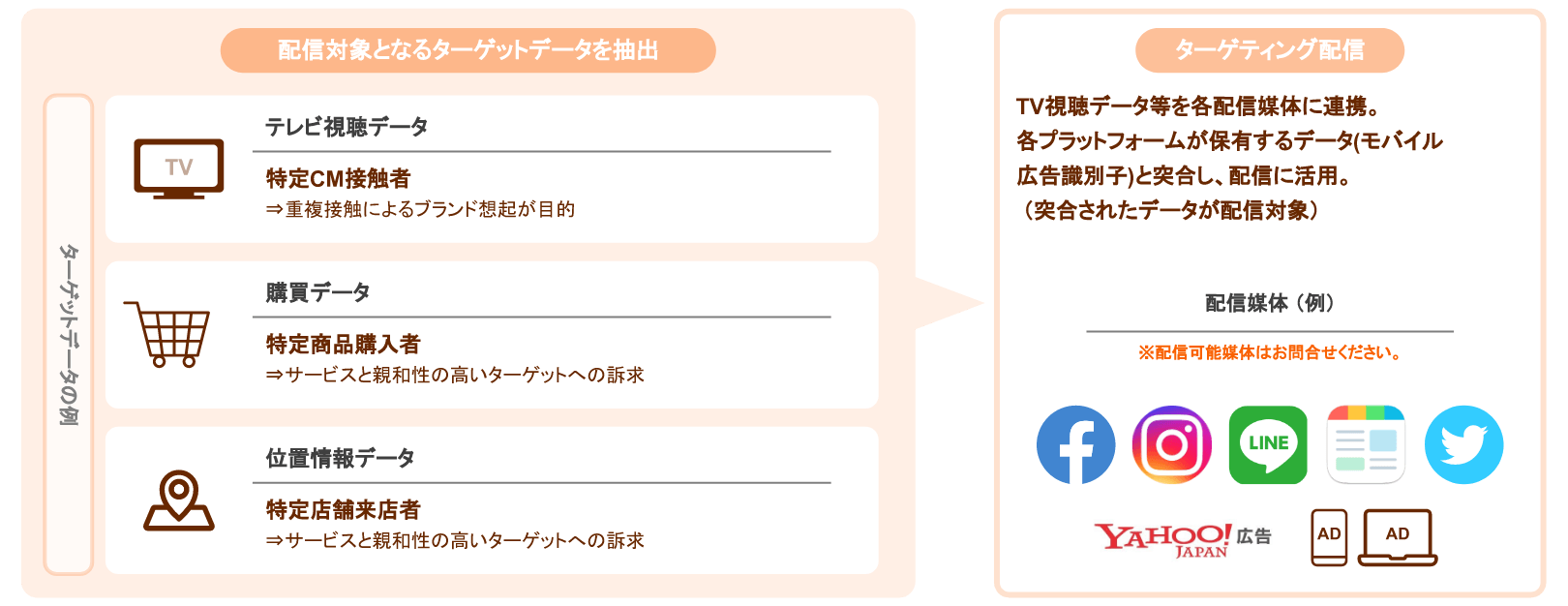 購買データやTV視聴データなど親和性の高いターゲットのデータを各配信媒体に連携。